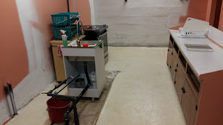 Then comes the tough part -- the layout. We're a bit hobbled because the drain and the water lines for the sink are embedded in the concrete floor, so unless we're prepared to jackhammer, we have to keep the sink in its current position. But that messes up the U-shape I want to form, because the drain is four feet out from the wall. We also can't put the cooktop near the sink, because that would mean having to drill through a thick concrete inside wall and putting a pipe across the laundry room ceiling to reach an outside wall in order to vent the stove hood. I think the better option is to put the stove under the window and vent out that way -- but that's fifteen feet from the sink. Aargh.